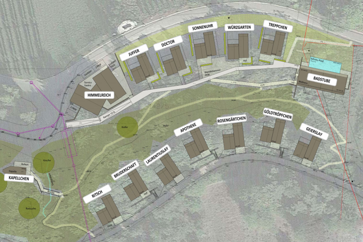 Die Planungen um das Chaletdorf Steillage gehen weiter voran – auch schon bis in die Details. Bei einem Feierabend-Wein kam uns die Idee, dass all unsere Häuschen Namen der örtlich angrenzenden Steillagen bekommen sollten. So kann zum einen eine schöne Zuordnung der Chalets gefunden werden und zum anderen die besonderen Steillagen der Mittelmosel für den Weintourismus hervorgehoben werden. Unter der Berücksichtigung, dass Haupthaus, Wellness-Haus und die Kapelle „speziellere“ Namen bekommen sollten, haben wir für die 12 Chalets „flussabwärts“ folgende Namen vergeben: